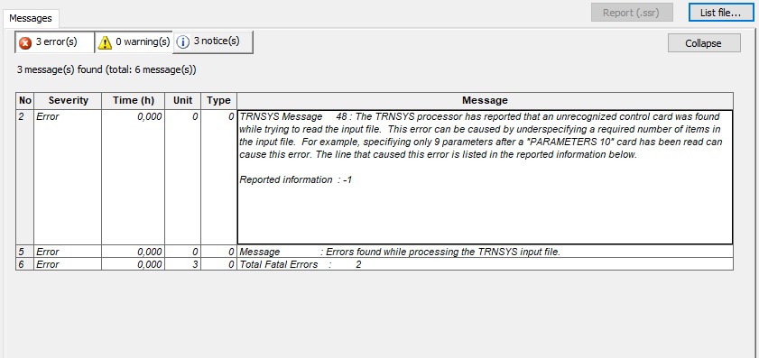 TRNSYS Message 48 : The TRNSYS processor has reported that an unrecognized control card was found while trying to read the input file. This error can be caused by underspecifying a required number of items in the input file. For example, specifiying only 9 parameters after a "PARAMETERS 10" card has been read can cause this error. The line that caused this error is listed in the reported information below.