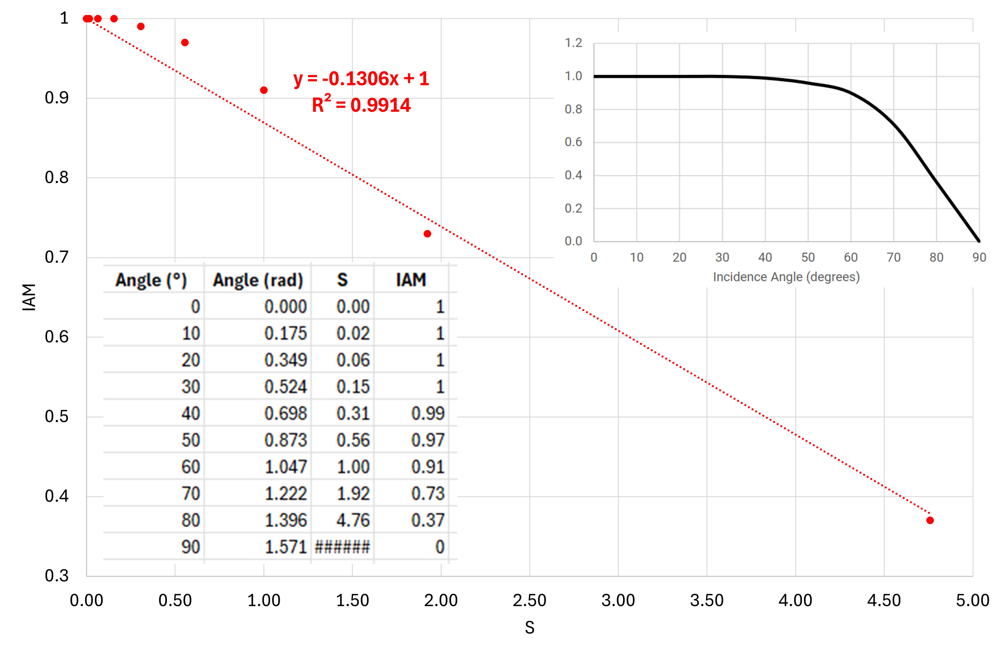 If I am reading the plot correctly the linear curve fit if IAM vs S is going to underpredict the IAM at near-normal incidence angles (meaning you'll collect a little bit less energy) and overpredict (very slightly) the IAM at higher incidence angles (when there isn't as much energy incident on the collector).